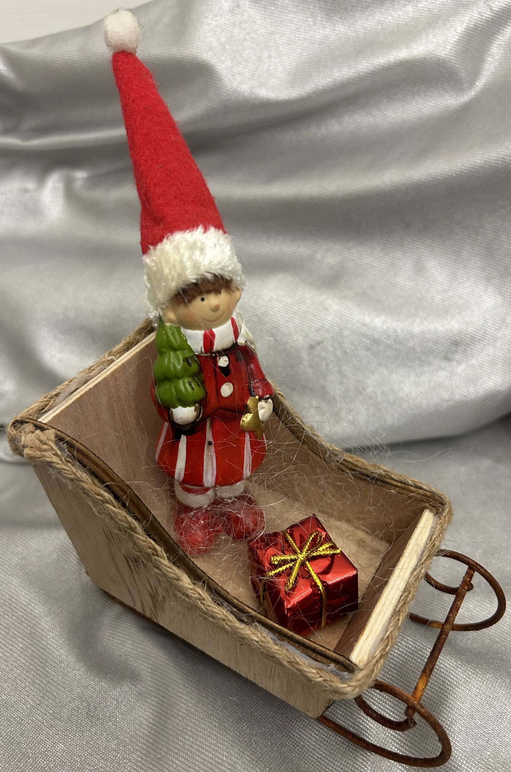 Deko Schlitten klein mit verschnörkelten Kufen Hellbraun Wichtel rot 64
